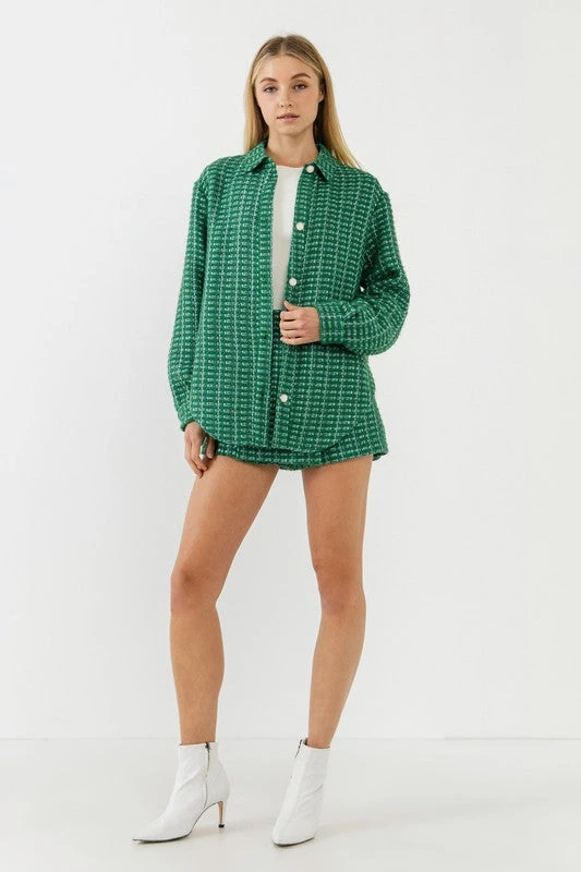 - Tweed fabric, Button and button hole, Long sleeves with cuffs