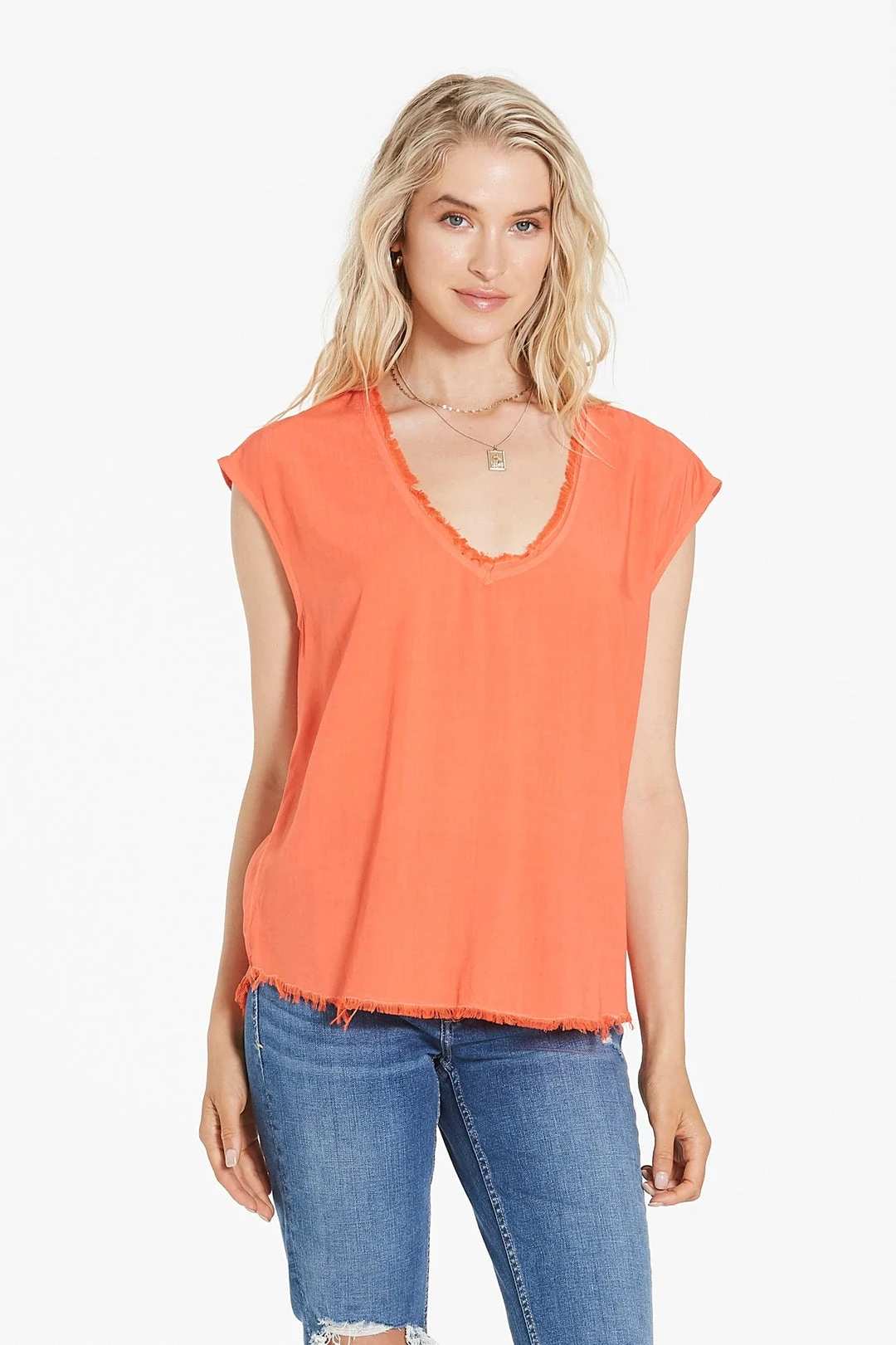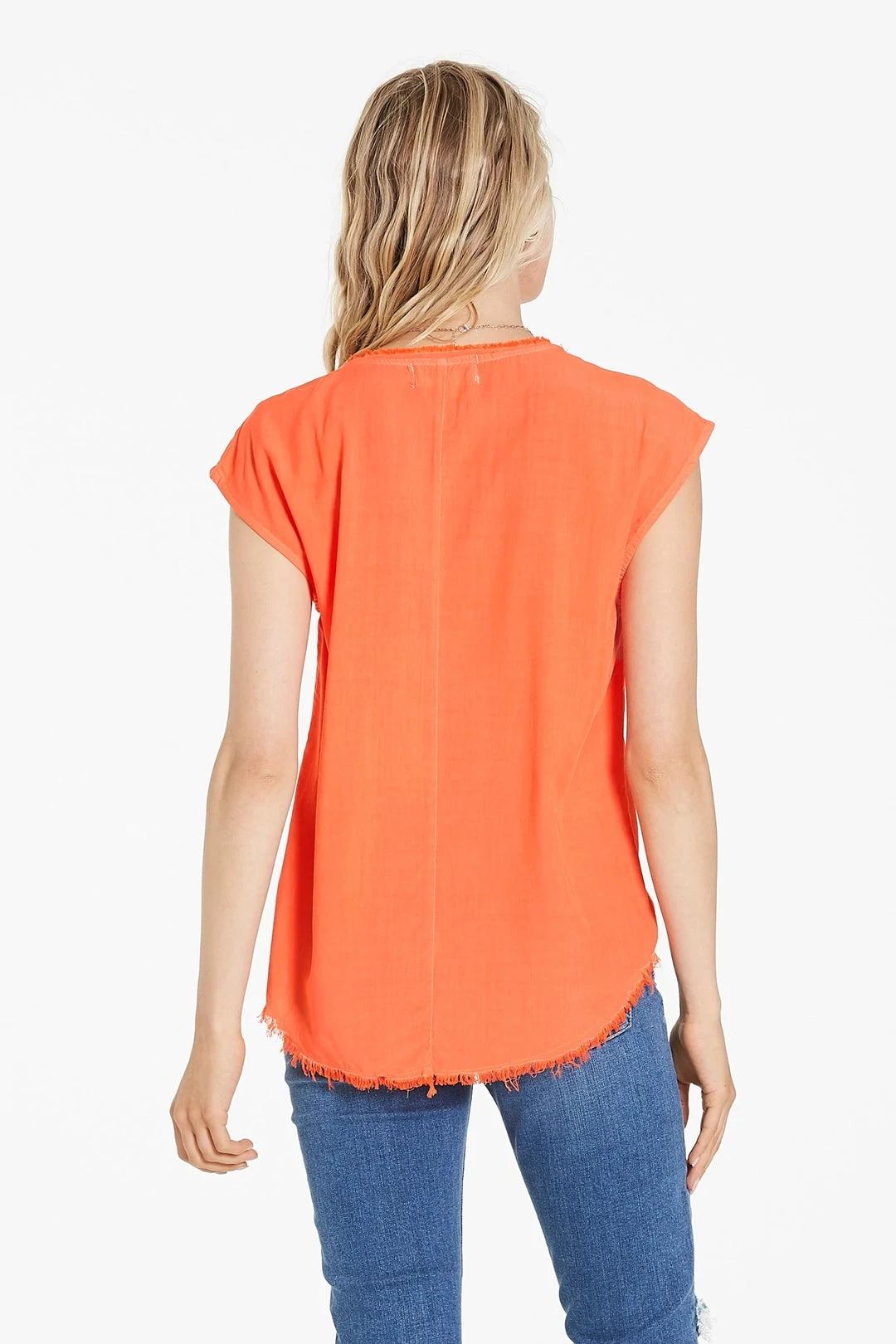 Lyocell breathable, frayed neck & hem, v-neck top finished sleeveless. Solid color woven on relaxed fit, styled with center back seam.