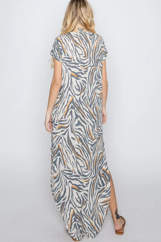 Zebra Print Maxi Dress With Side Slit And Round Hem